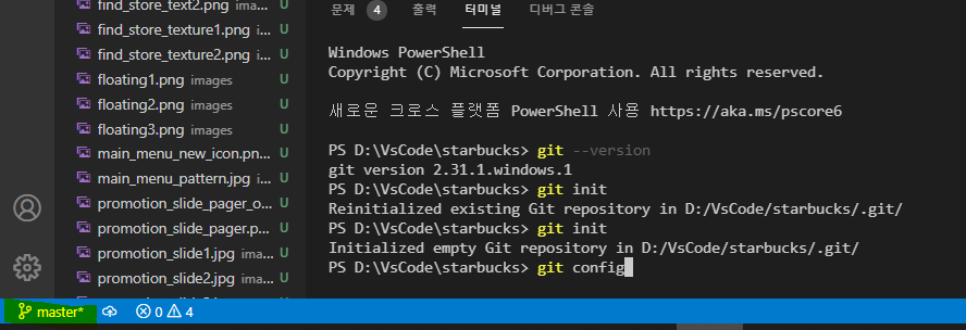 깃 선언 (git init) 하단에 master로 지정되어졌는지 확인
