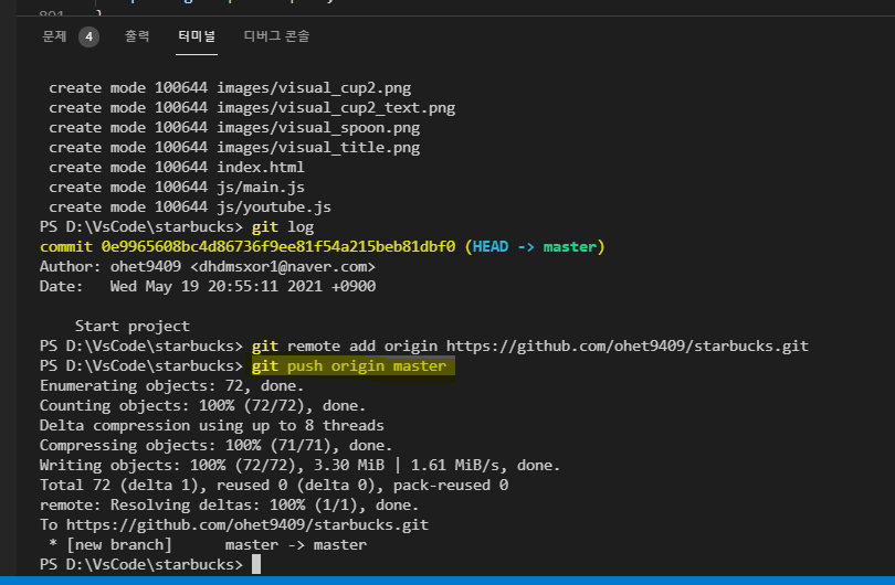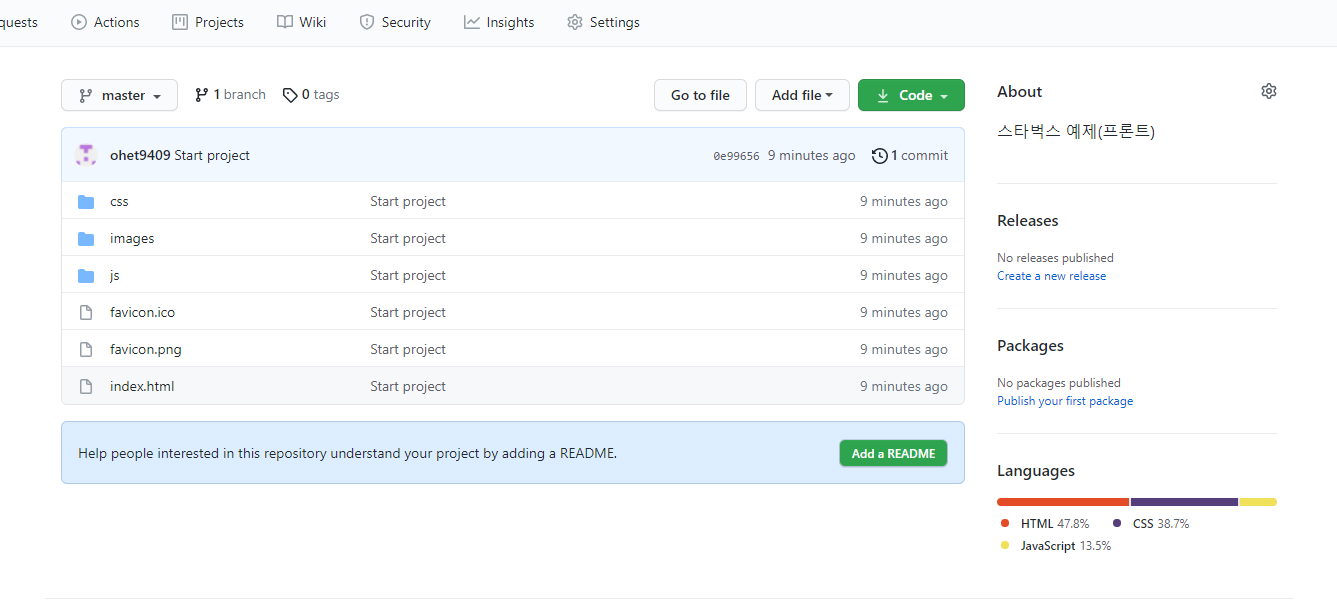 원격 저장소에 프로젝트 파일을 올린다(master 브렌치 사용)