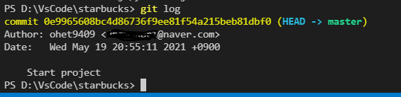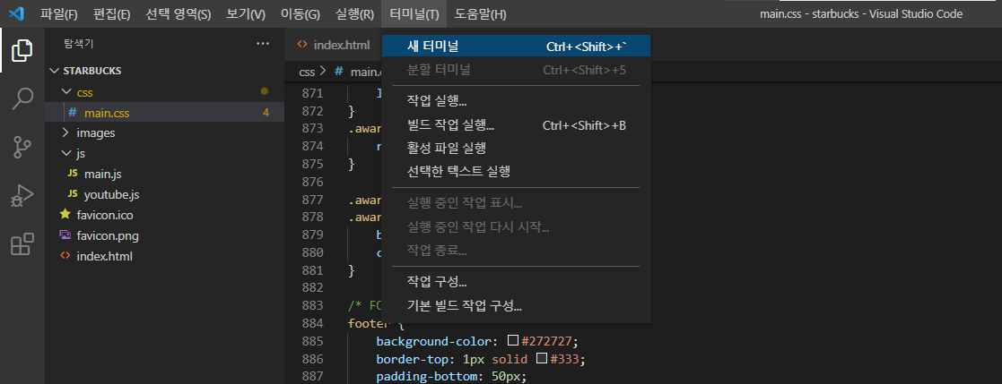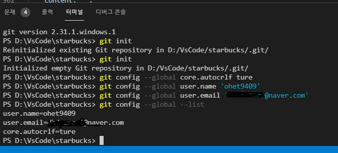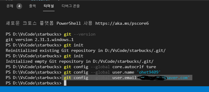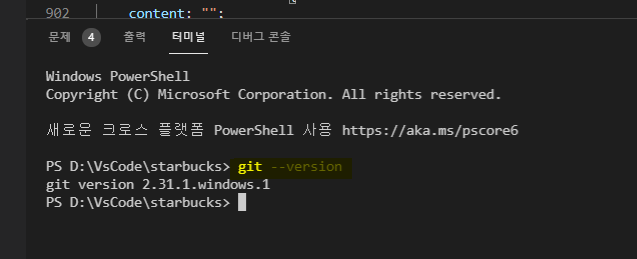 VS Code를 실행하여 해당 프로젝트를 열어준 후 터미널을 실행 (git 설치후 VS Code를 재시작 해주어야 한다)