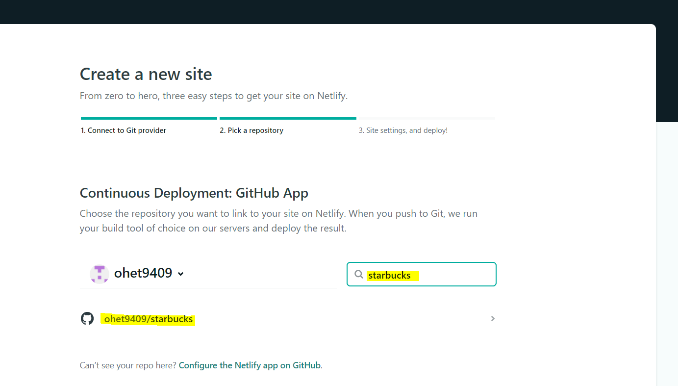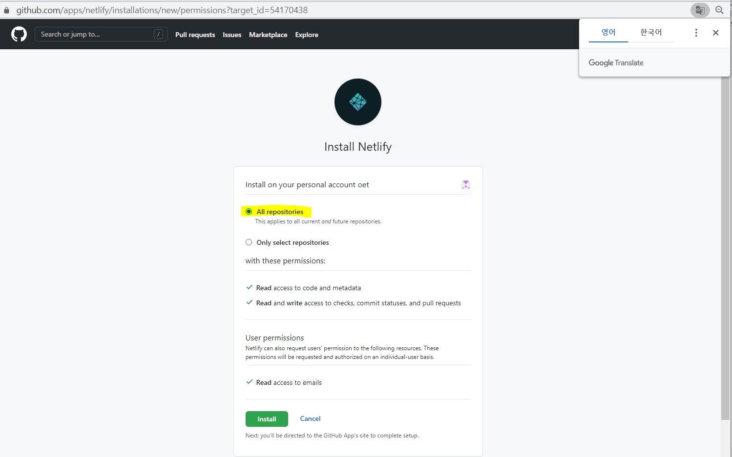 netlify는 안전한 사이트이기 때문에 All repositories로 선택하는 것이 관리하기 편하기 때문에 권장된다