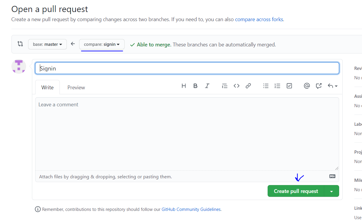 우측 브렌치를 병합할 브렌치로 변경 후 하단에 수정사항을 확인
