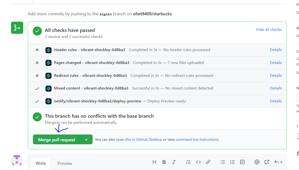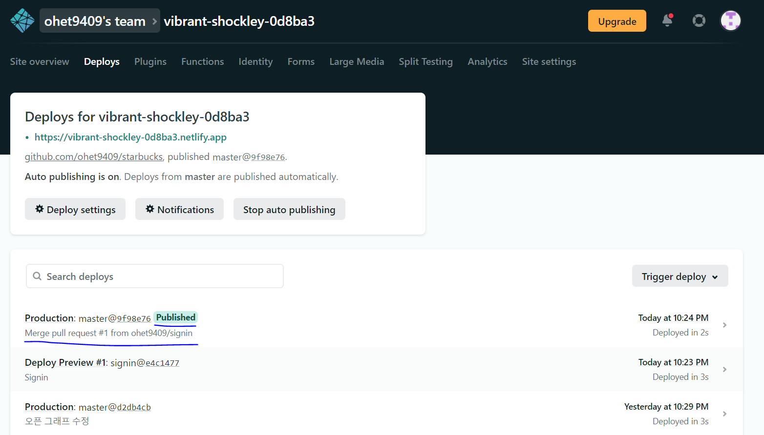 netlify에서도 확인가능(자동으로 배포되기 때문에) master 브렌치를 기준으로 배포 됨