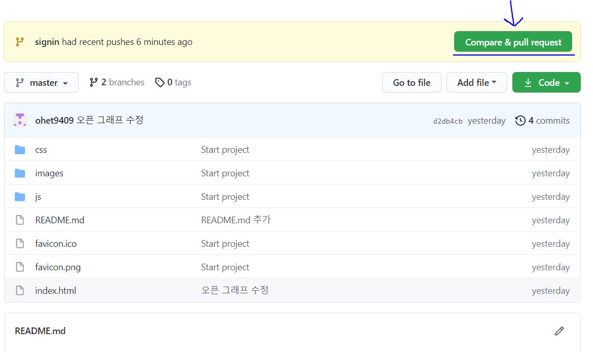 우측 브렌치를 병합할 브렌치로 변경 후 하단에 수정사항을 확인