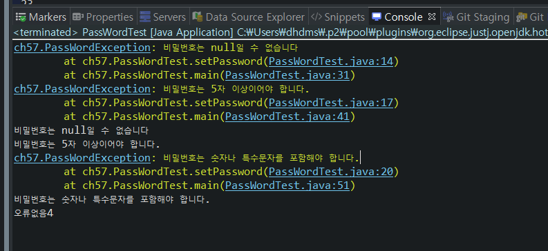 throw new PassWordException("비밀번호는 5자 이상이어야 합니다.");