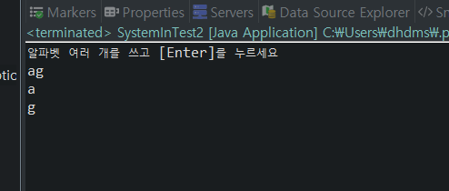 System.out.println("알파벳 여러 개를 쓰고 [Enter]를 누르세요");