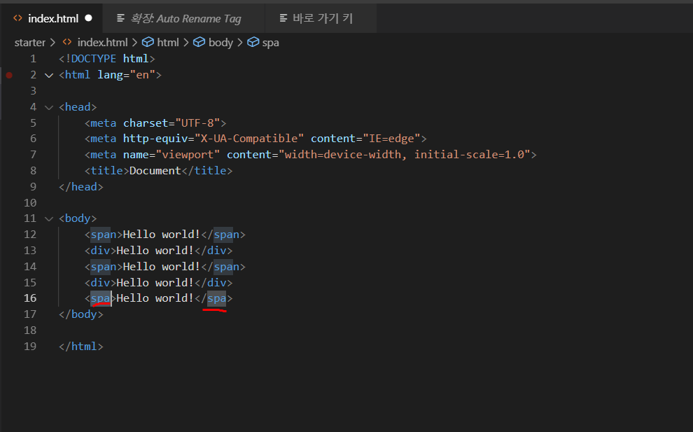 앞 태그를 수정하면 자동으로 뒤에도 수정되어 지는것을 확인할 수 있다