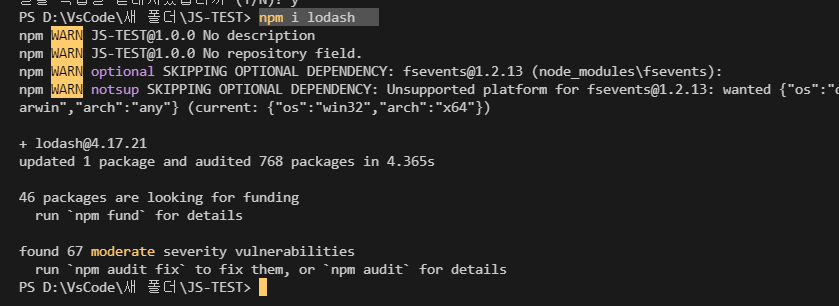 터미널에서 lodash 설치