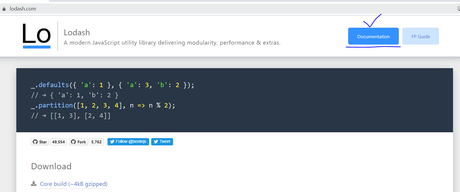 _.defaults({ 'a': 1 }, { 'a': 3, 'b': 2 });_.partition([1, 2, 3, 4], n => n % 2);DownloadLodash is released under the MIT license & supports modern environments. Review the build differences & pick one that’s right for you.InstallationIn