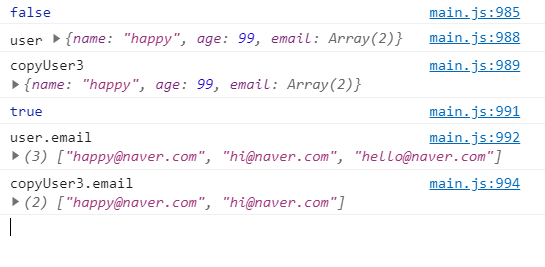 // email은 배열 형태이기 때문에 기존의 메모리를 그대로 바라보고 있다.