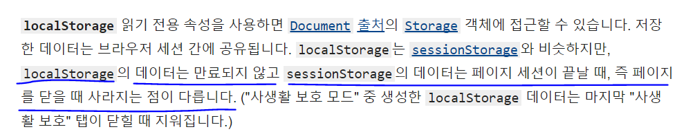 https://developer.mozilla.org/ko/docs/Web/API/Window/localStorage