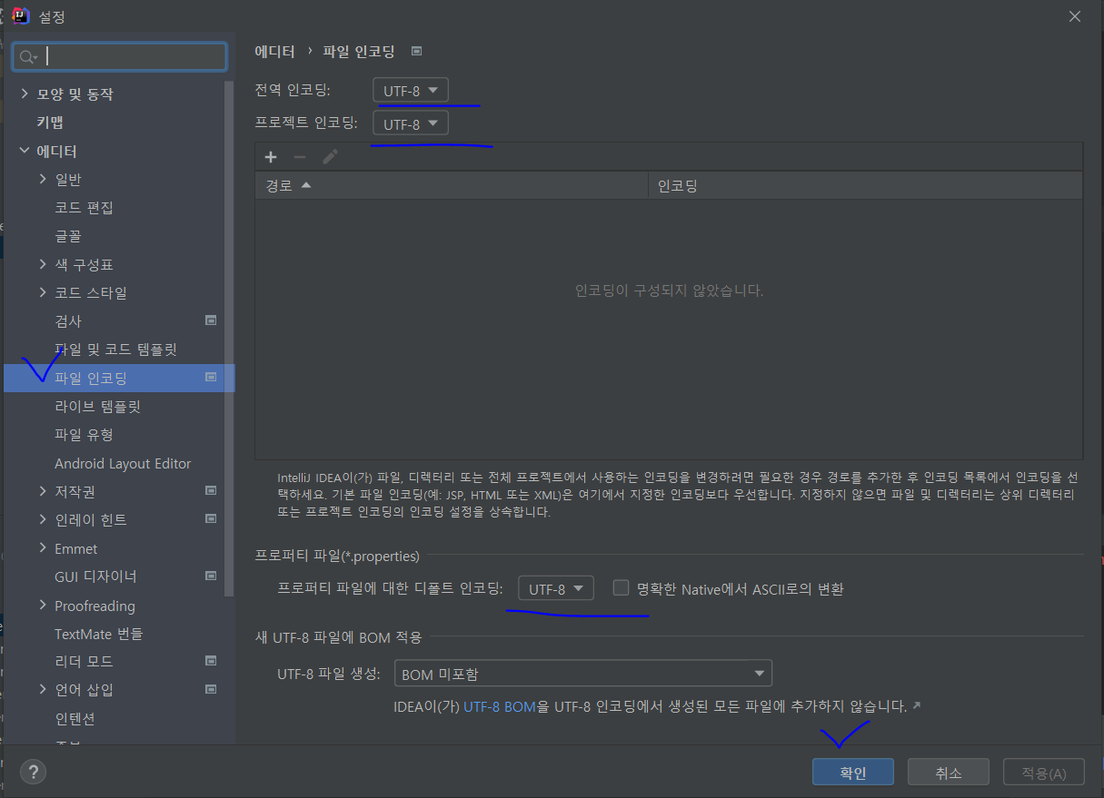 File - > Settings -> 검색 (encoding) -> 파일 인코딩 -> UTF-8 설정