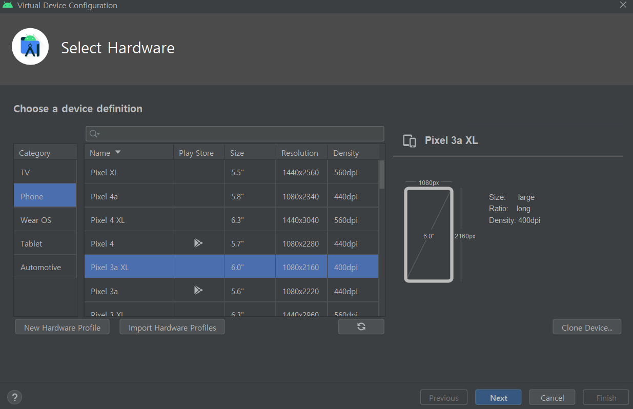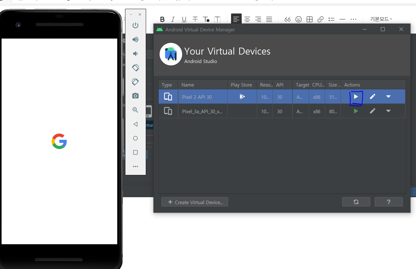 디바이스 선택 가능 (Play Strore가 실행되는 Pixel 2로 진행하였다.)