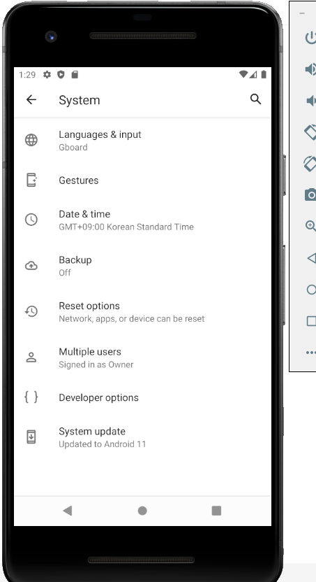 상위 메뉴로 이동하여 system 메뉴에 Developer options 메뉴가 생긴 것을 확인