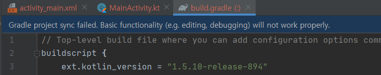 안드로이드 스튜디오 - gradle project sync failed. basic functionality (e.g. editing debugging) will not work properly