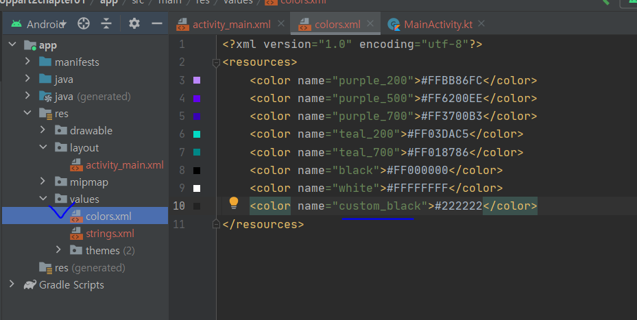 색상 설정 (res -> values -> colors.xml에서 저장하여 사용 가능하다)