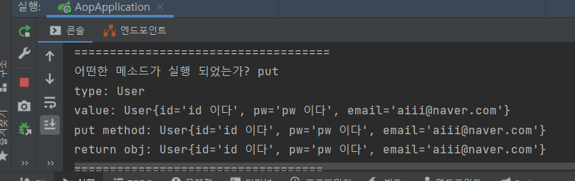 // AOP가 동작하기 전에 어떠한 데이터가 전달되었는지 확인