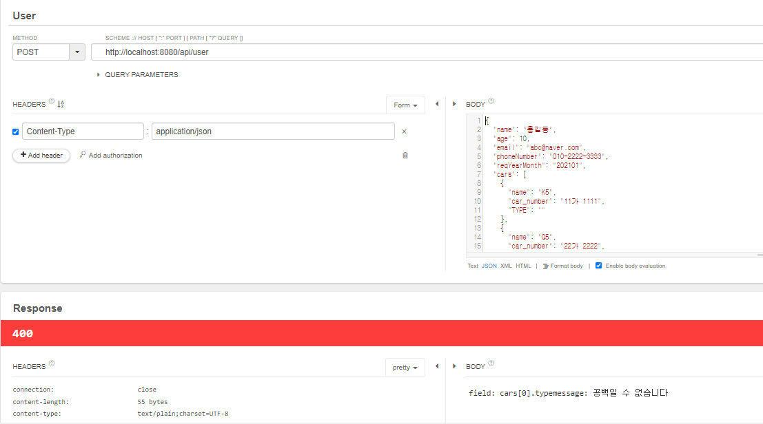 dto -> @Valid 어노테이션을 입력하여 유효성 검사를 진행하도록 설정한다.
