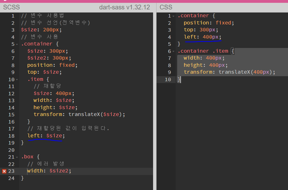 SCSS에서는 변수를 사용하여 값을 저장한 후 각 속성에 입력할 수 있다.