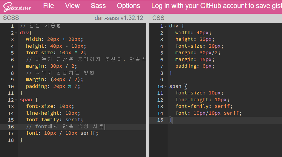 SCSS 에서는 각 속성에 값을 넣어 줄때 사칙연산을 사용해서 입력할 수 있다.