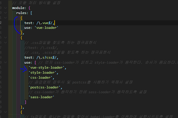 vue확장자 파일을 해석해서 vue-loader가 동작하도록 설정