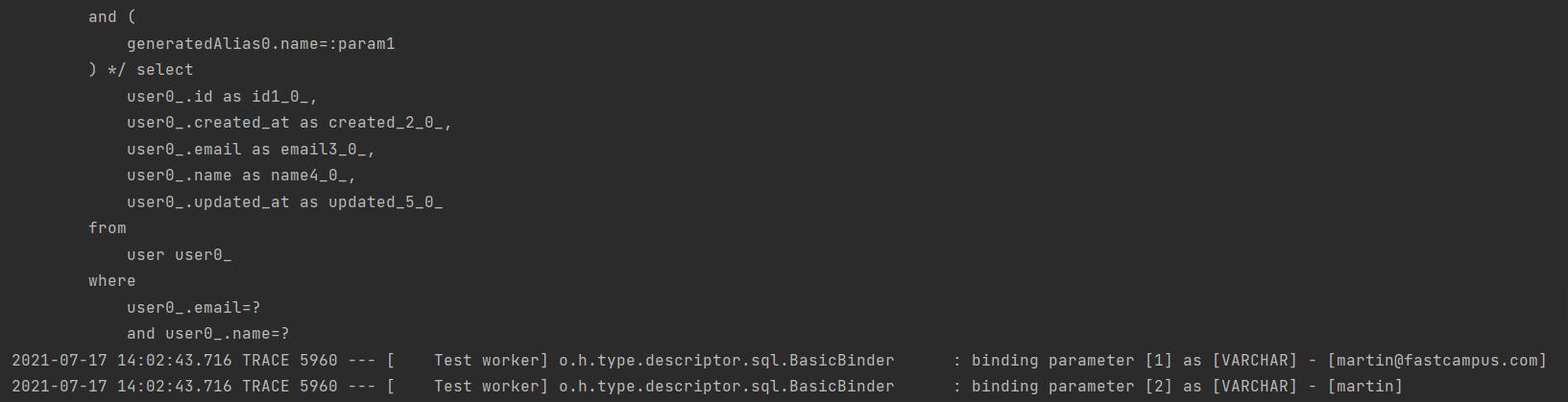 System.out.println("findByEmailAndName: " + userRepository.findByEmailAndName("martin@fastcampus.com","martin"));