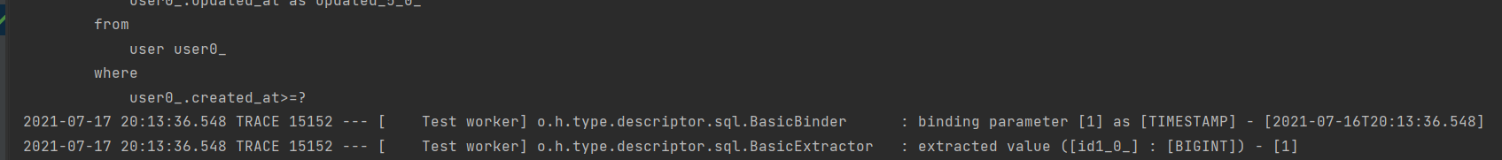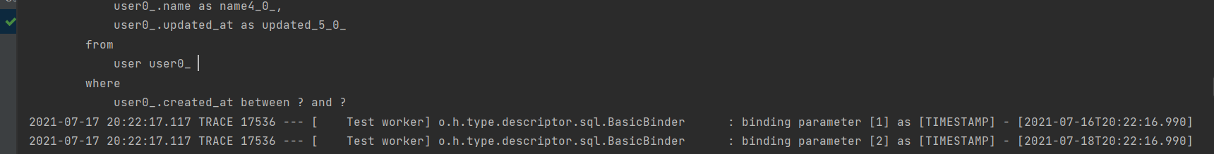 System.out.println("findByCreatedAtBetween(: " + userRepository.findByCreatedAtBetween(LocalDateTime.now().minusDays(1L), LocalDateTime.now().plusDays(1L)));