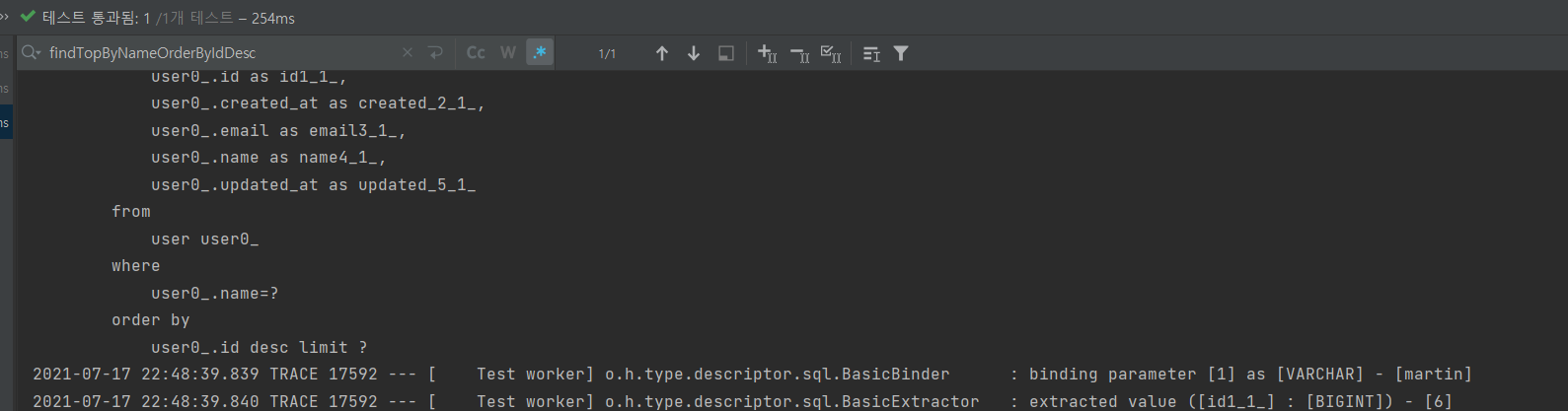 System.out.println("findTopByNameOrderByIdDesc: " + userRepository.findTopByNameOrderByIdDesc("martin"));