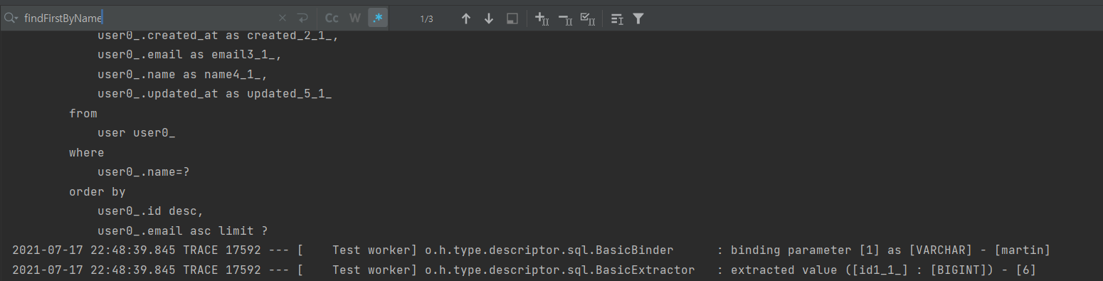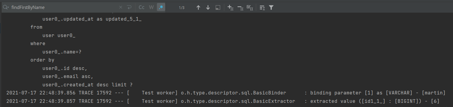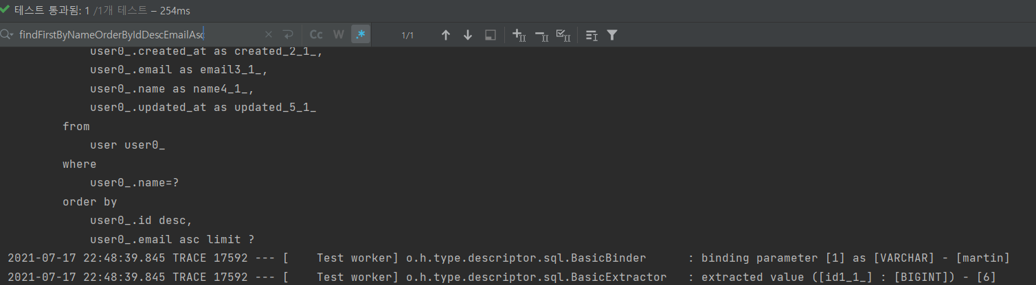 System.out.println("findFirstByNameOrderByIdDescEmailAsc: " + userRepository.findFirstByNameOrderByIdDescEmailAsc("martin"));