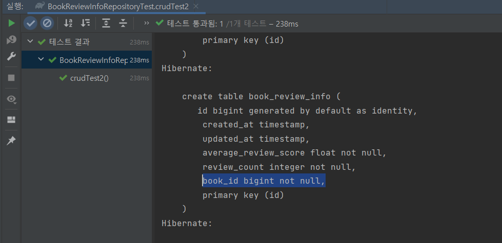 result2 >>> BookReviewInfo(super=BaseEntity(createdAt=2021-07-24T22:58:16.320, updatedAt=2021-07-24T22:58:16.320), id=1, book=Book(super=BaseEntity(createdAt=2021-07-24T22:58:16.274, updatedAt=2021-07-24T22:58:16.274), id=1, name=Jpa 초격차 패키지, category=null, authorId=1, publisherId=1), averageReviewScore=4.5, reviewCount=2)반응형