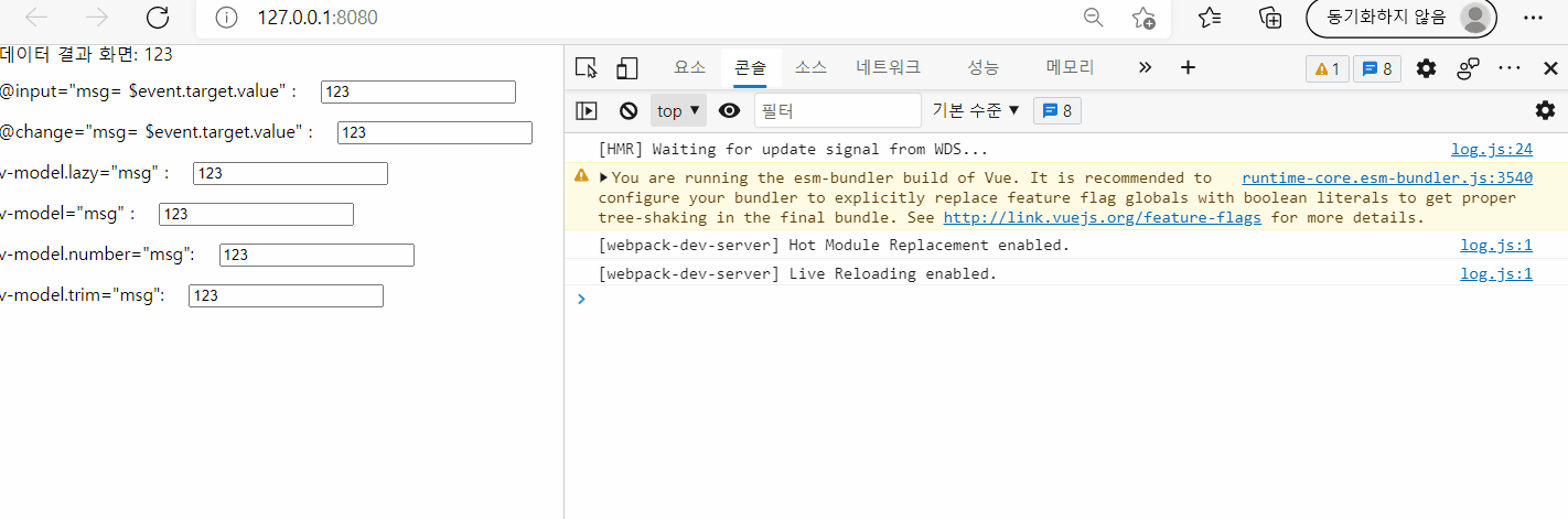 @input 이벤트와 마찬가지로 값을 입력하면 바로 데이터가 변경된다.