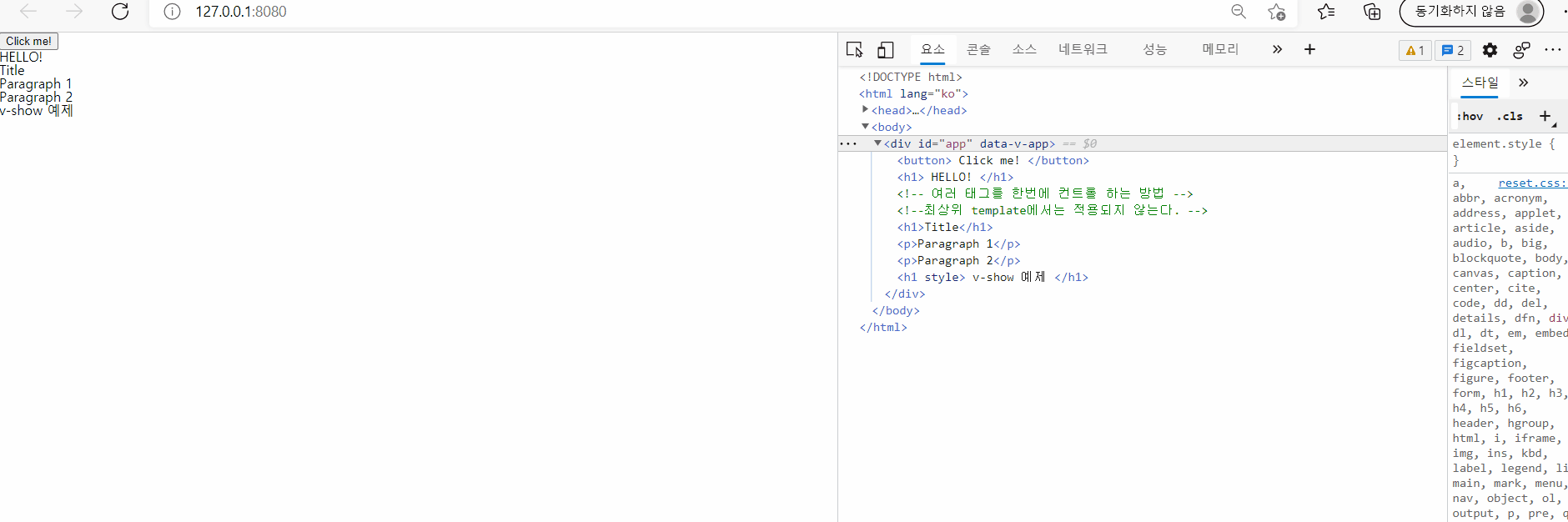 v-show: v-if와 마찬가지로 조건이 참일 때 Html 태그를 보여준다.