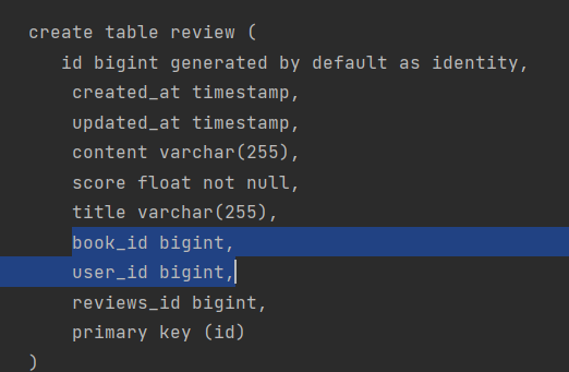 Review: [Review(super=BaseEntity(createdAt=2021-08-08T17:18:17.538, updatedAt=2021-08-08T17:18:17.538), id=1, title=리뷰 제목, content=리뷰 내용, score=5.0, user=User(id=1, name=martin, email=martin@naver.com, createdAt=2021-08-08T17:18:17.309, updatedAt=2021-08-08T17:18:17.309, gender=null), book=Book(super=BaseEntity(createdAt=2021-08-08T17:18:17.538, updatedAt=2021-08-08T17:18:17.538), id=1, name=jpa 패키지, category=null, authorId=null))]