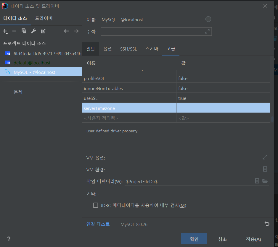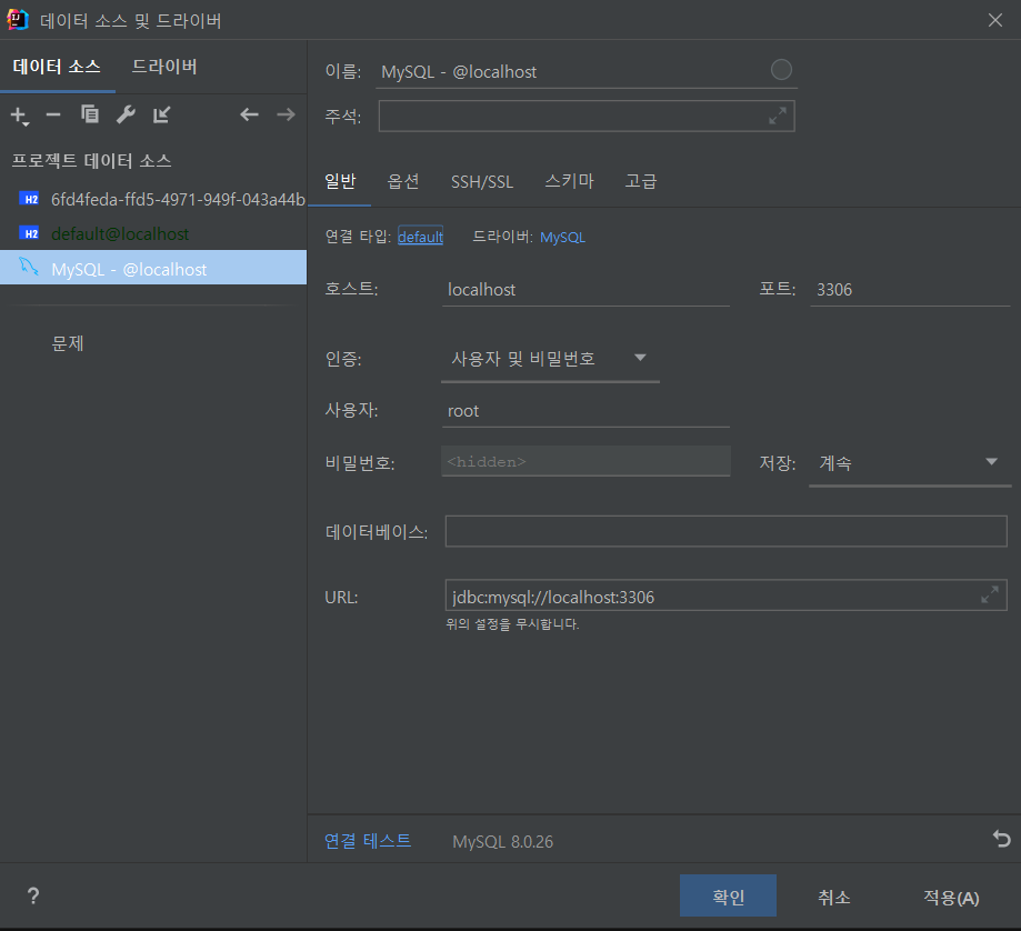 그 후 아래와 같이 기본 설정을 입력하고 연결 테스트를 진행한다.