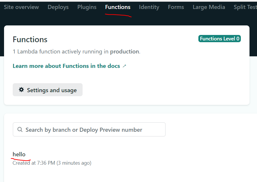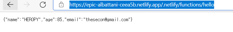 url 접근으로 확인 -> 뒷부분에 .netlify/functions/hello 추가