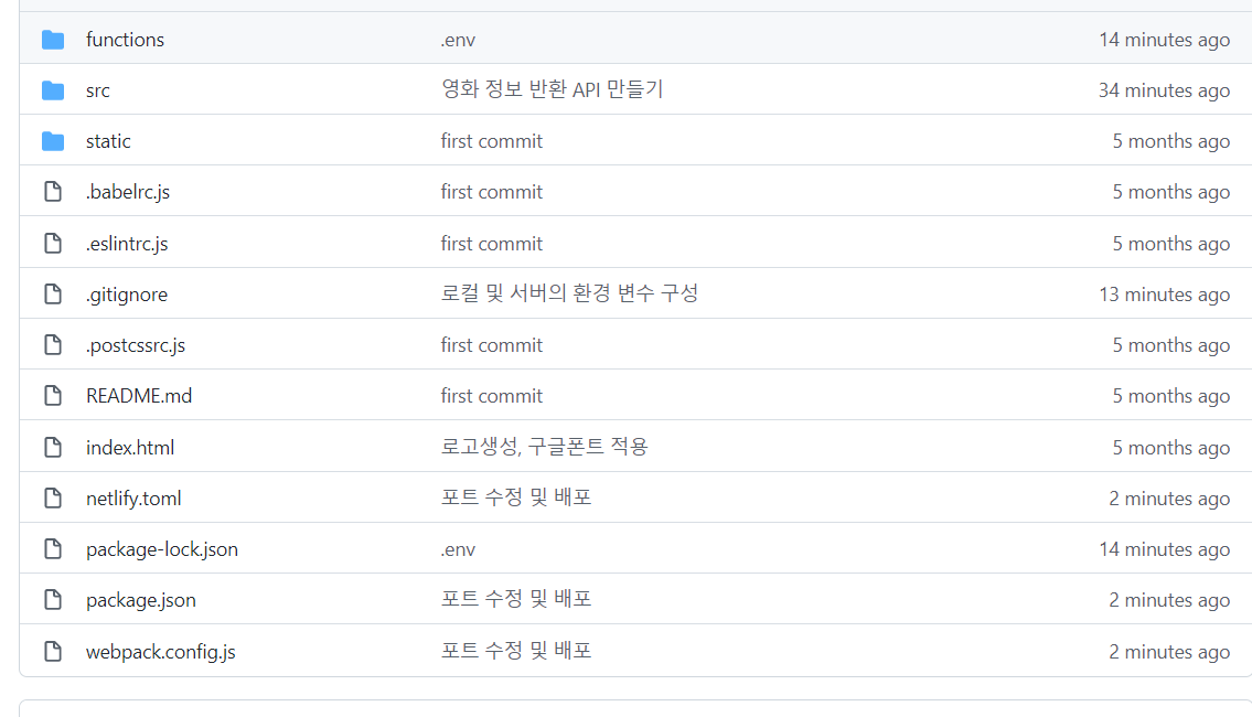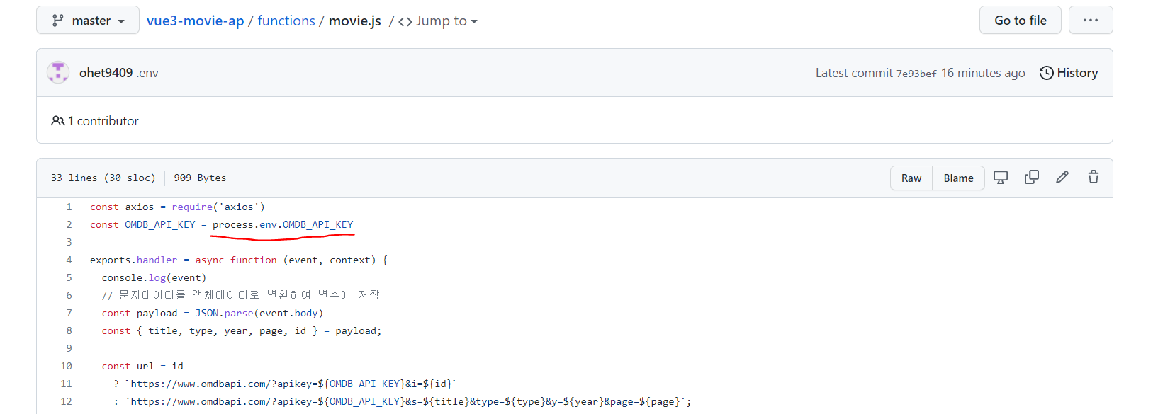 github에 올리고 확인 -> .env 파일이 없는것을 확인, movie.js파일에서 중요정보 보여지는지 확인