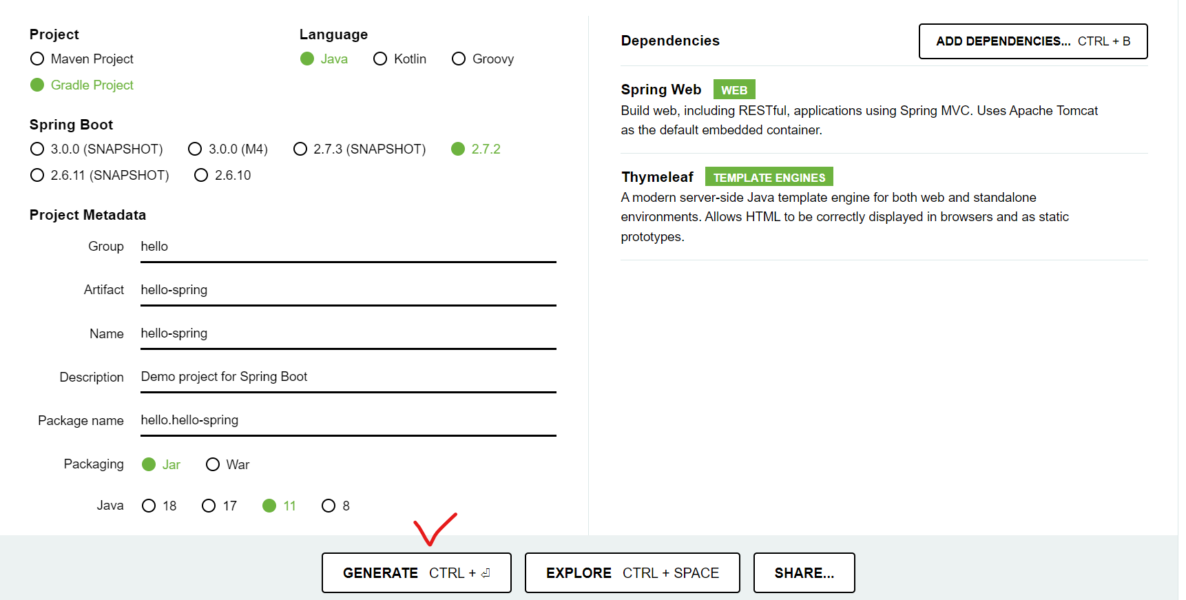 web 프로젝트를 진행할 것 이기 때문에 Spring Web을 추가해주고