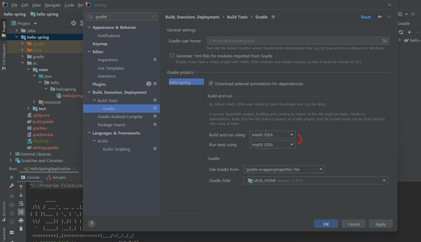 Gradle로 설정이 되어있다면 인텔리J로 변경해준다.