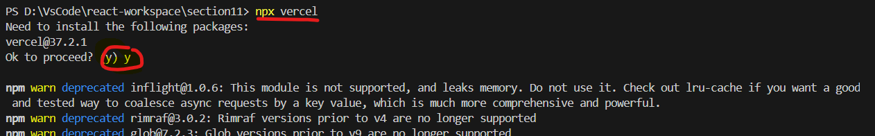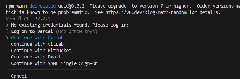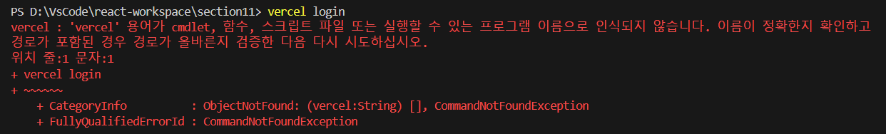 만약 아래와 같이 vercel login 명령어가 에러가 발생한다면 cli를 설치 해준다.