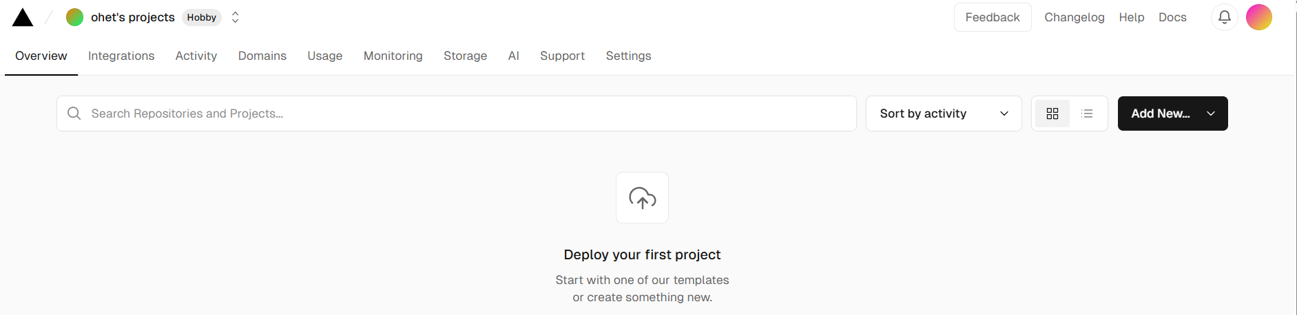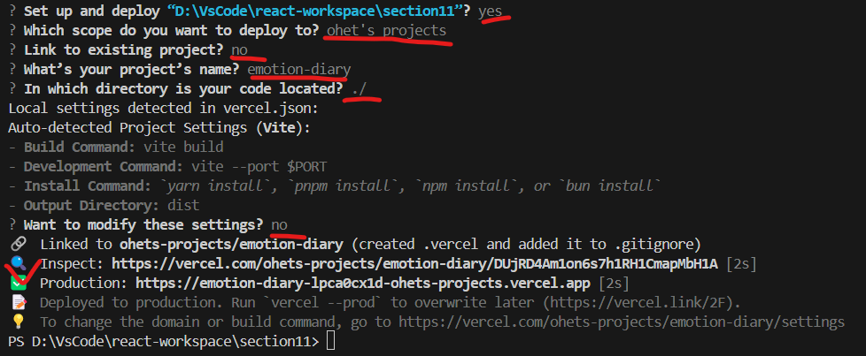 vercel 명령어를 터미널에 입력하여 배포 진행 (나는 cli 설치하였더니 별 다른 명령어 입력 없이 배포까지 진행 되었다.)