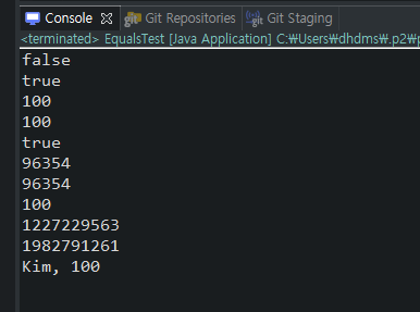 System.out.println(std1.equals(std2)); // 두 객체의 주소값이 같은지 확인 false -> 재정의 후 true