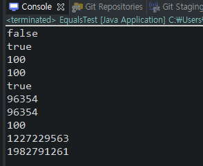 - 두 인스턴스의 주소 값을 비교하여 true/false를 반환